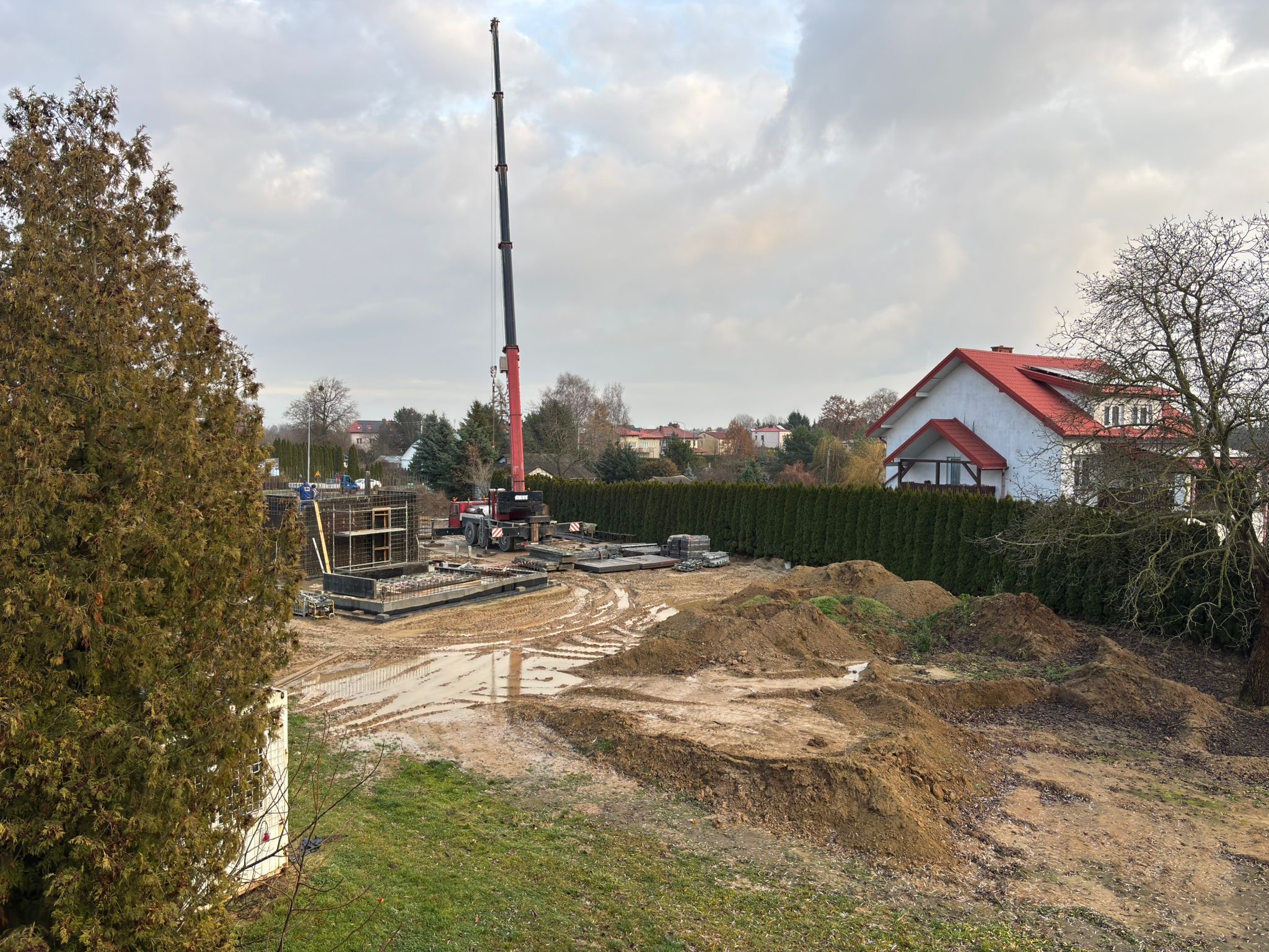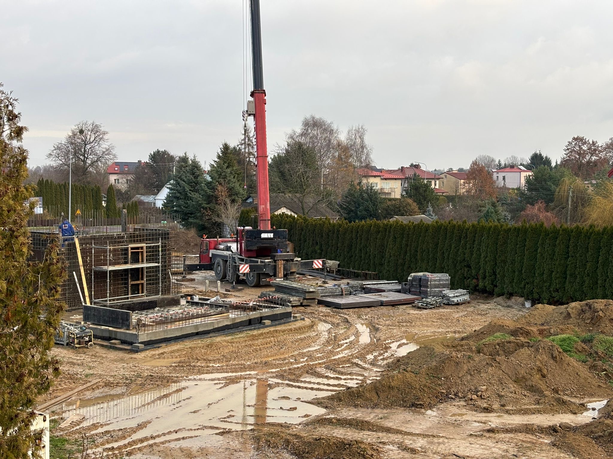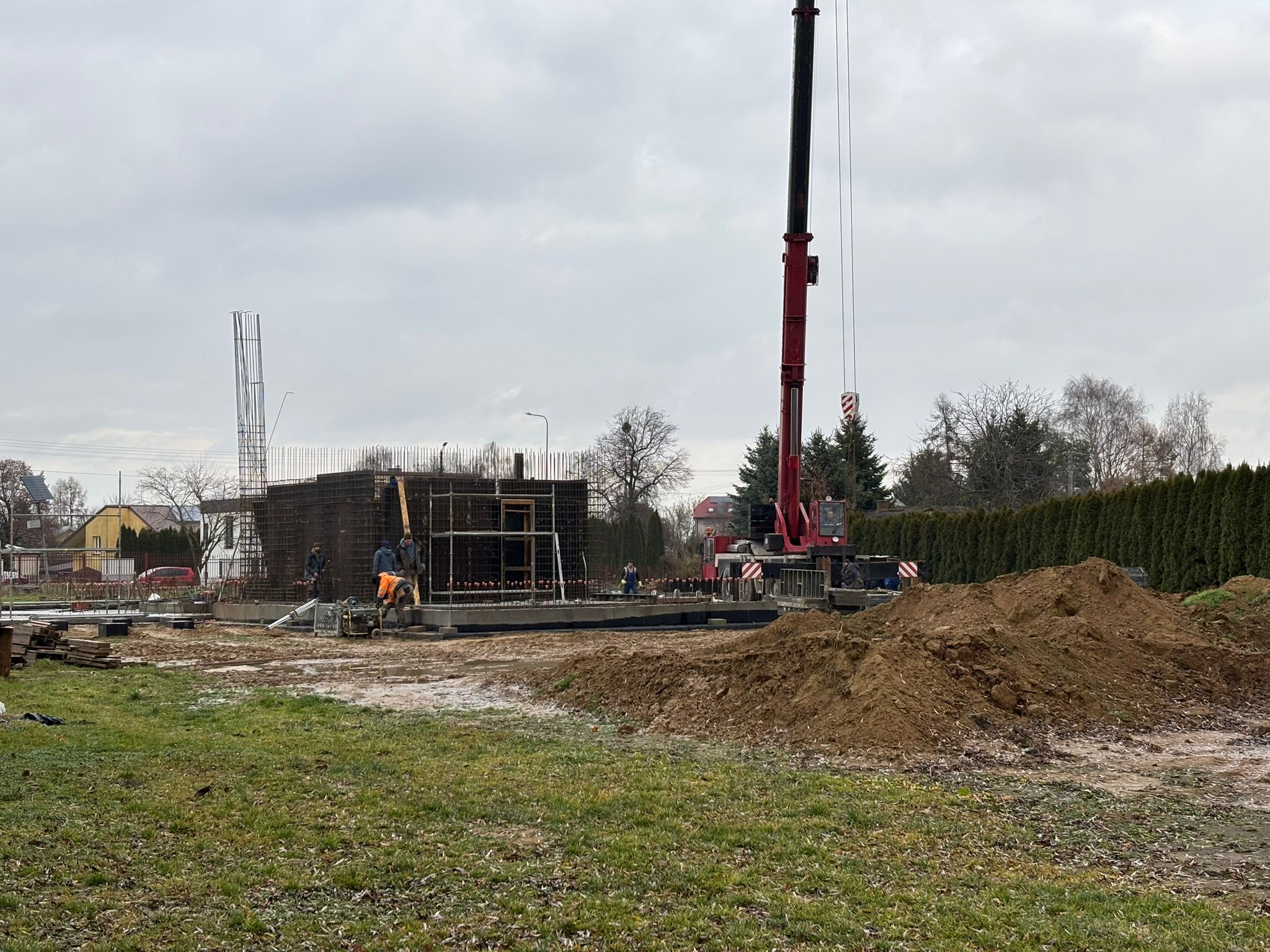W połowie listopada rozpoczęły się prace przy stawianiu ścian kościoła. Na początku grudnia widoczne są już pierwsze ściany – zakrystii i kaplicy adoracji.